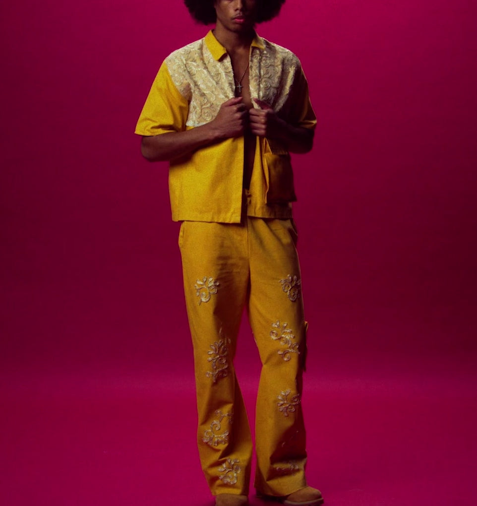 Overdyedhh cargo boycut leg pants with hand-sewn floral motifs. Recycled curtains fabrics transformed into clothes