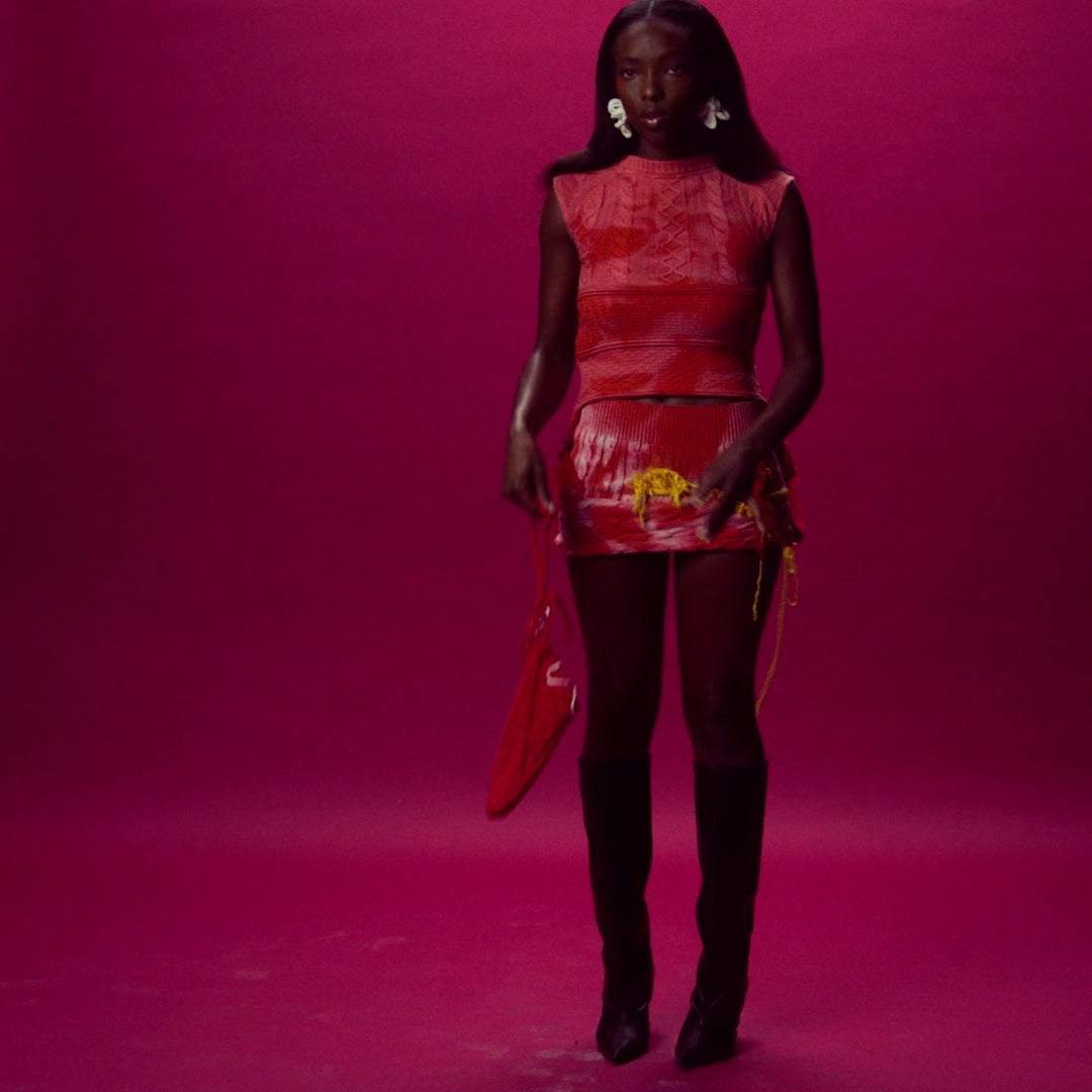 Recycled knit top transformed into a 2-piece. The sleeve level formes the knit skirt and the top level tightens close to the body with handmade wool.